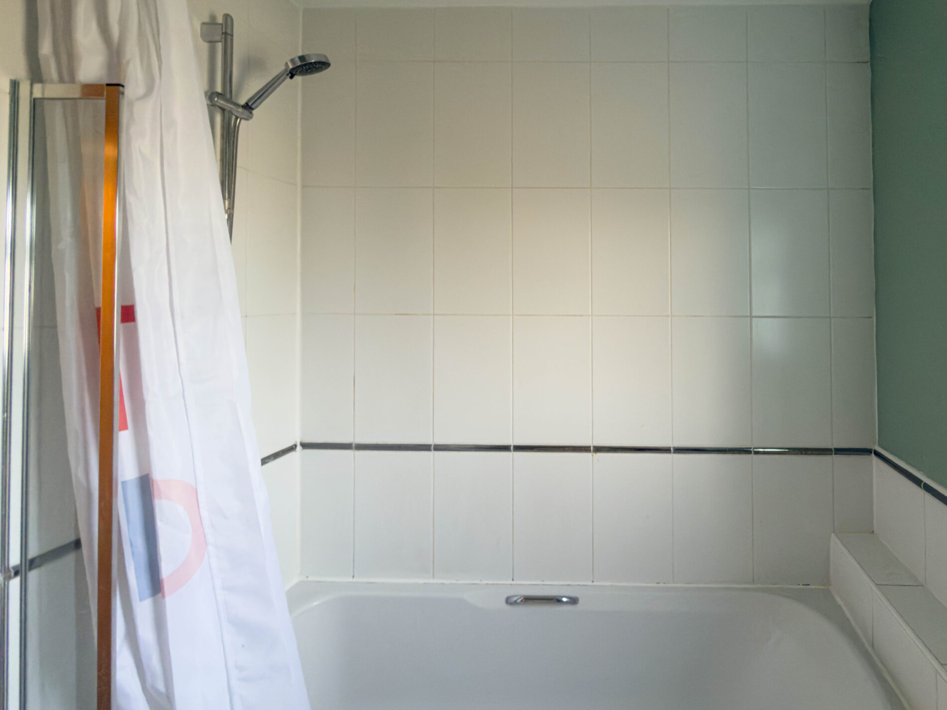 With a double glazed window to rear, a modern white suite comprises: Panelled bath with shower over, a wash hand basin with vanity unit below, low flush W.C., an extractor fan and a heated ladder back towel rail.