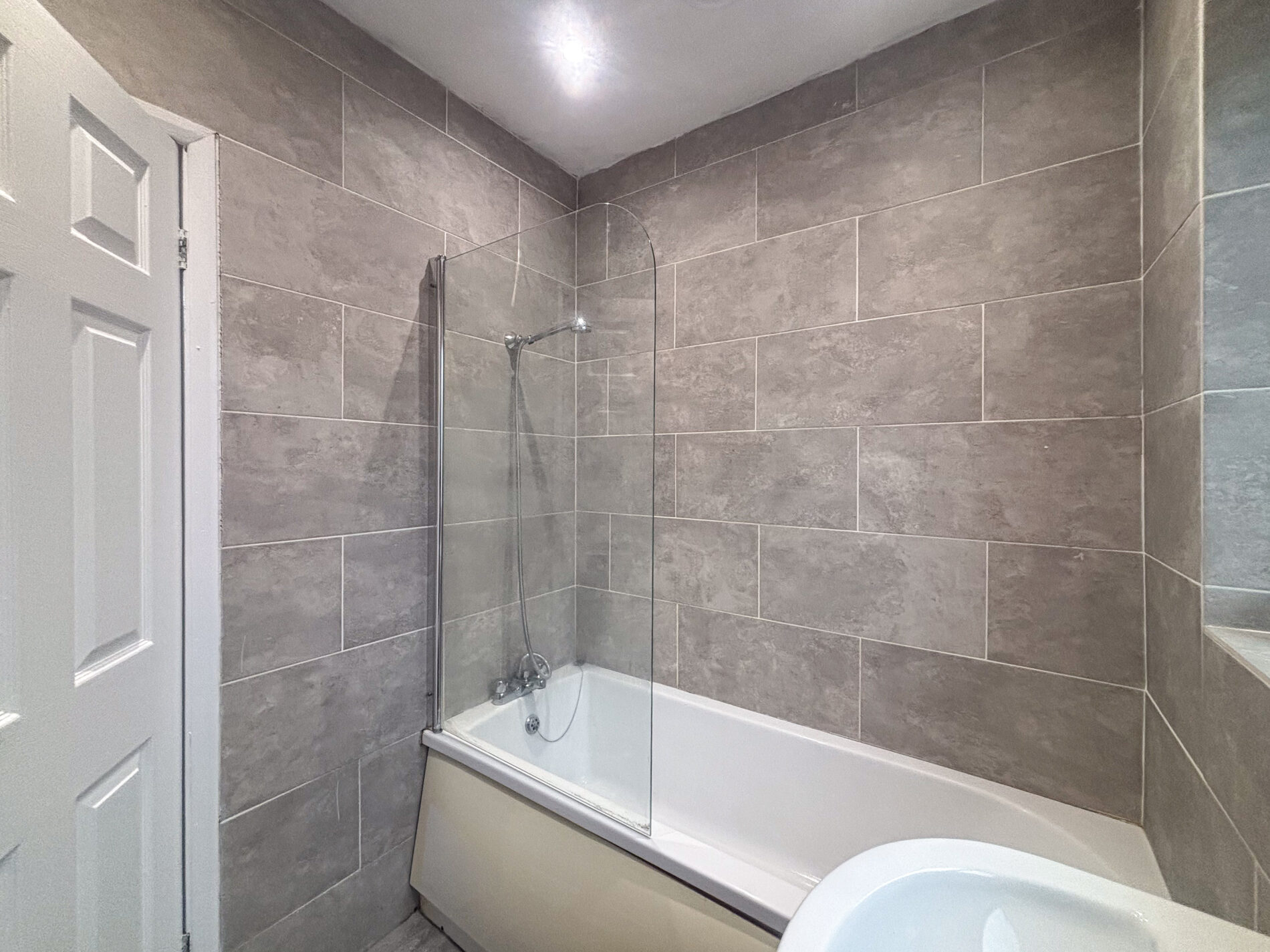 To the rear of the property, the bathroom is fully tiled, the bath has a shower fitted above and a large heated towel radiator. There is an obscured glass window to the rear and an extraction fan for ventilation.
