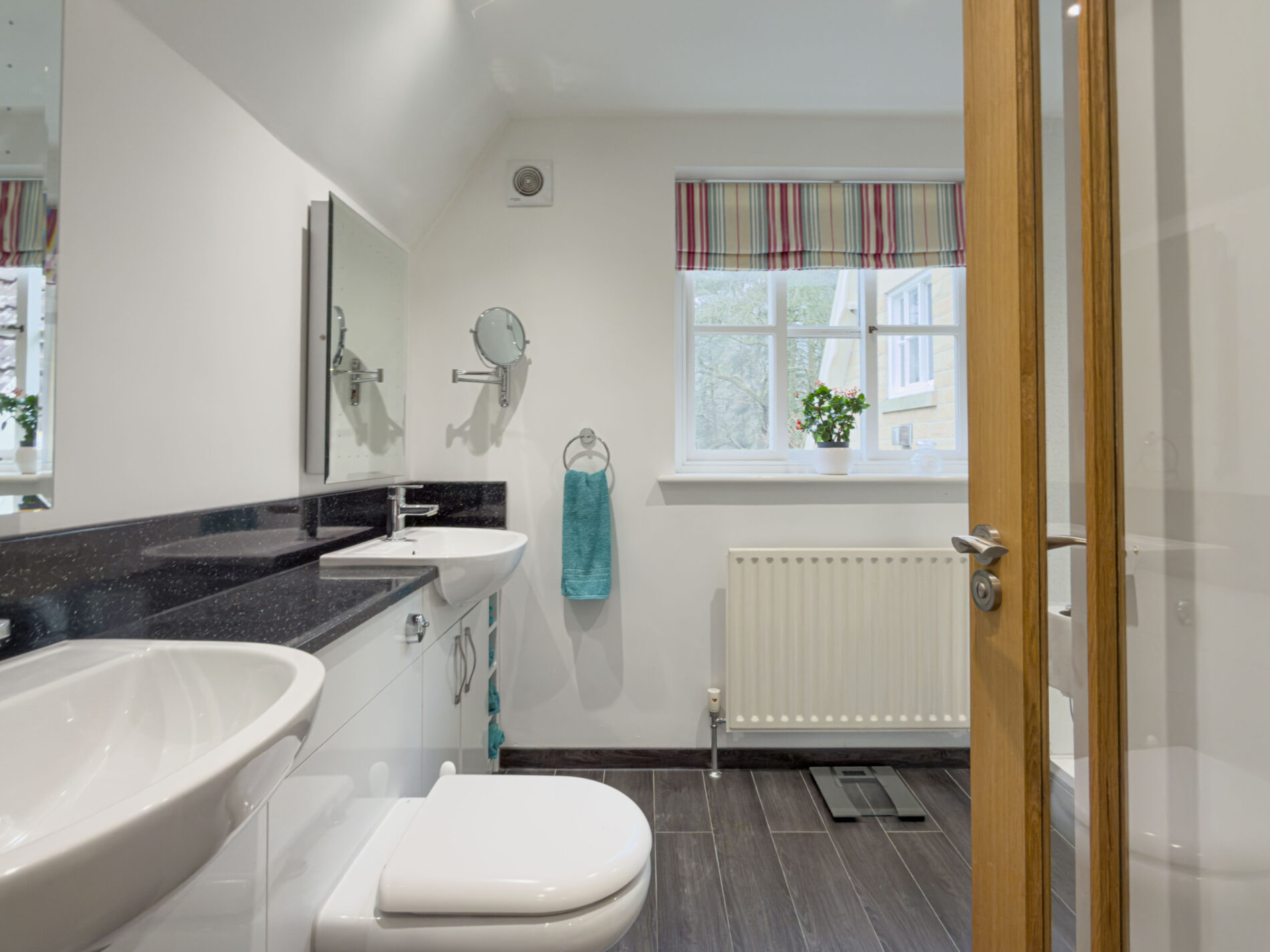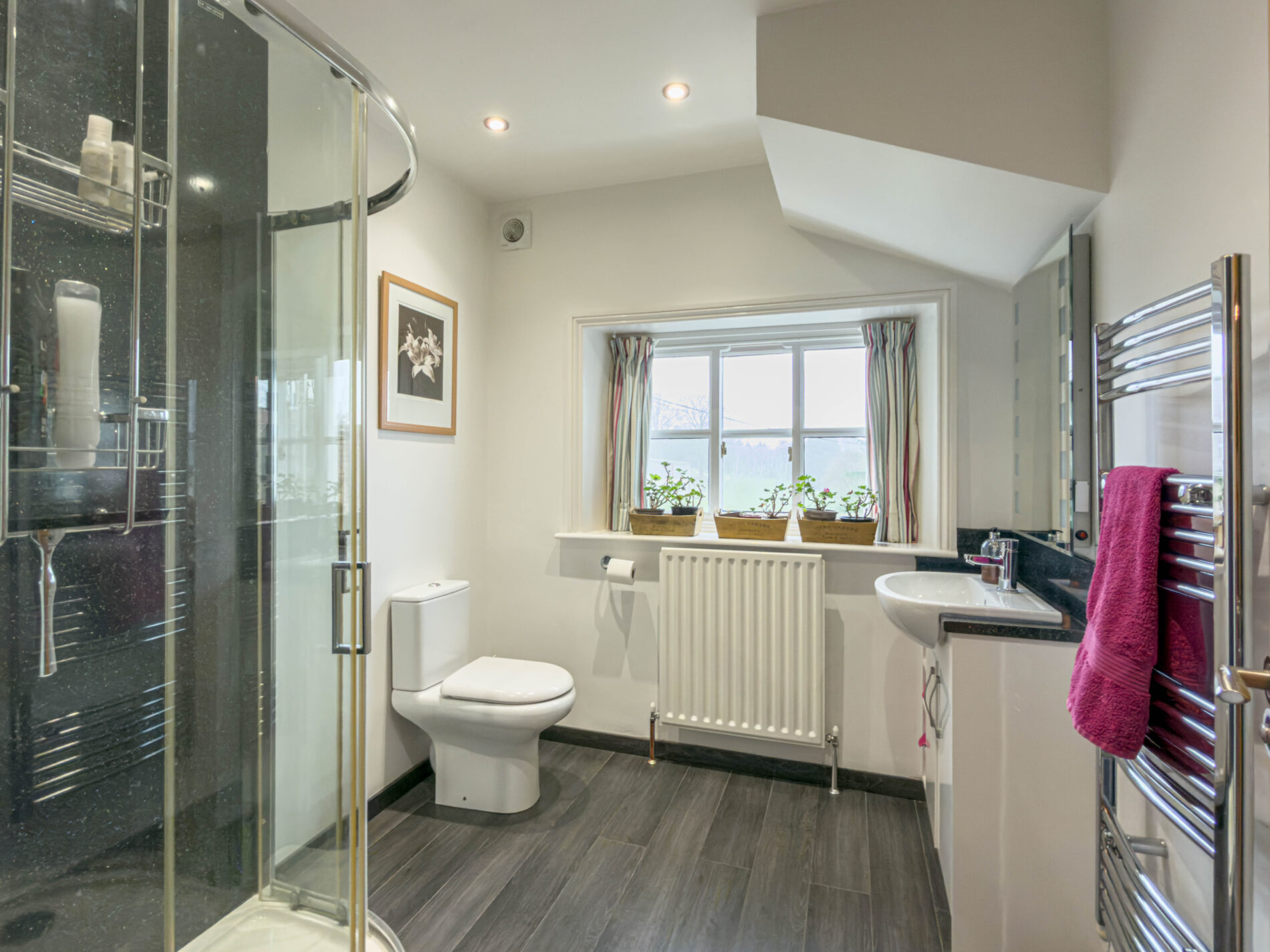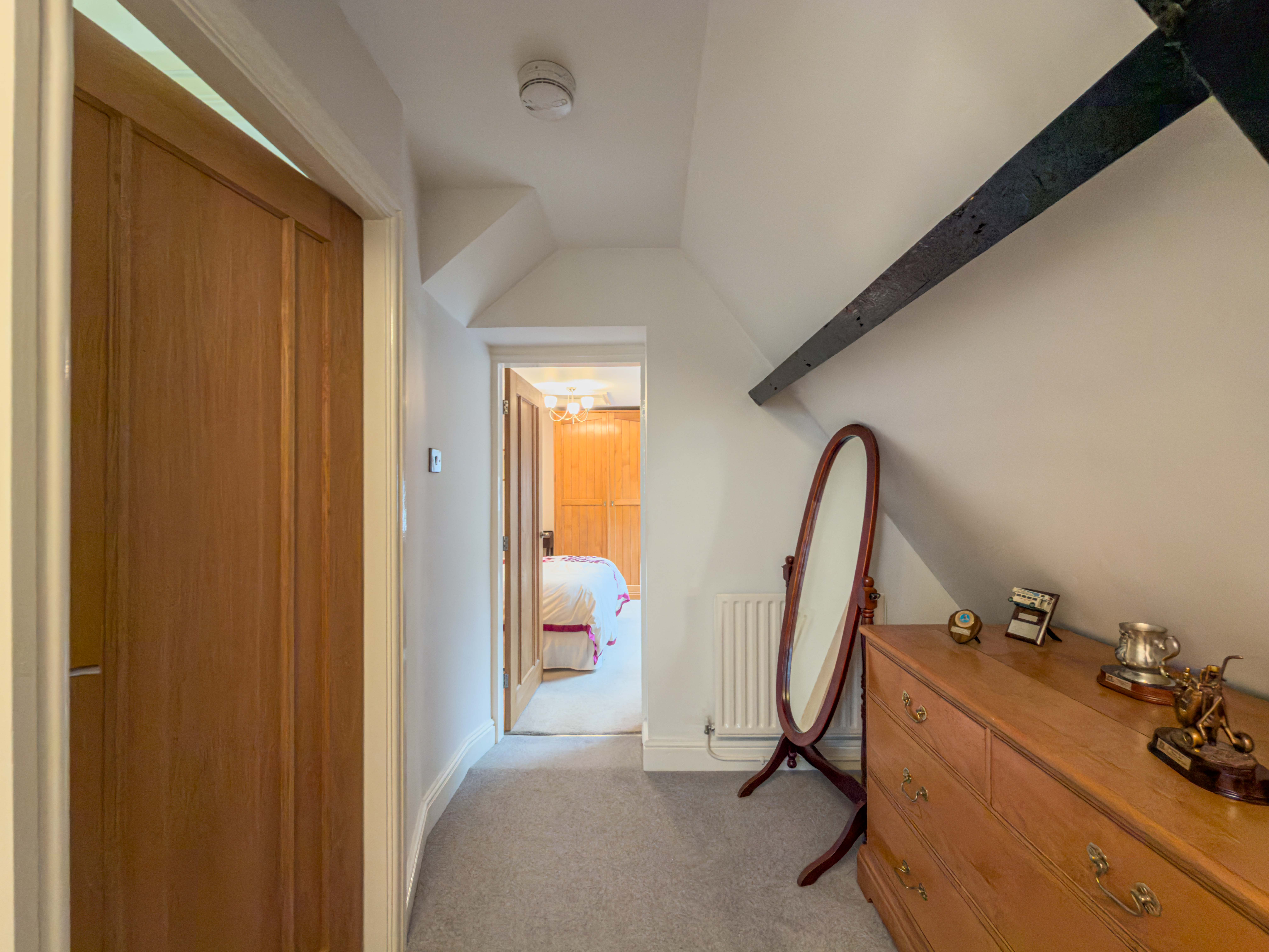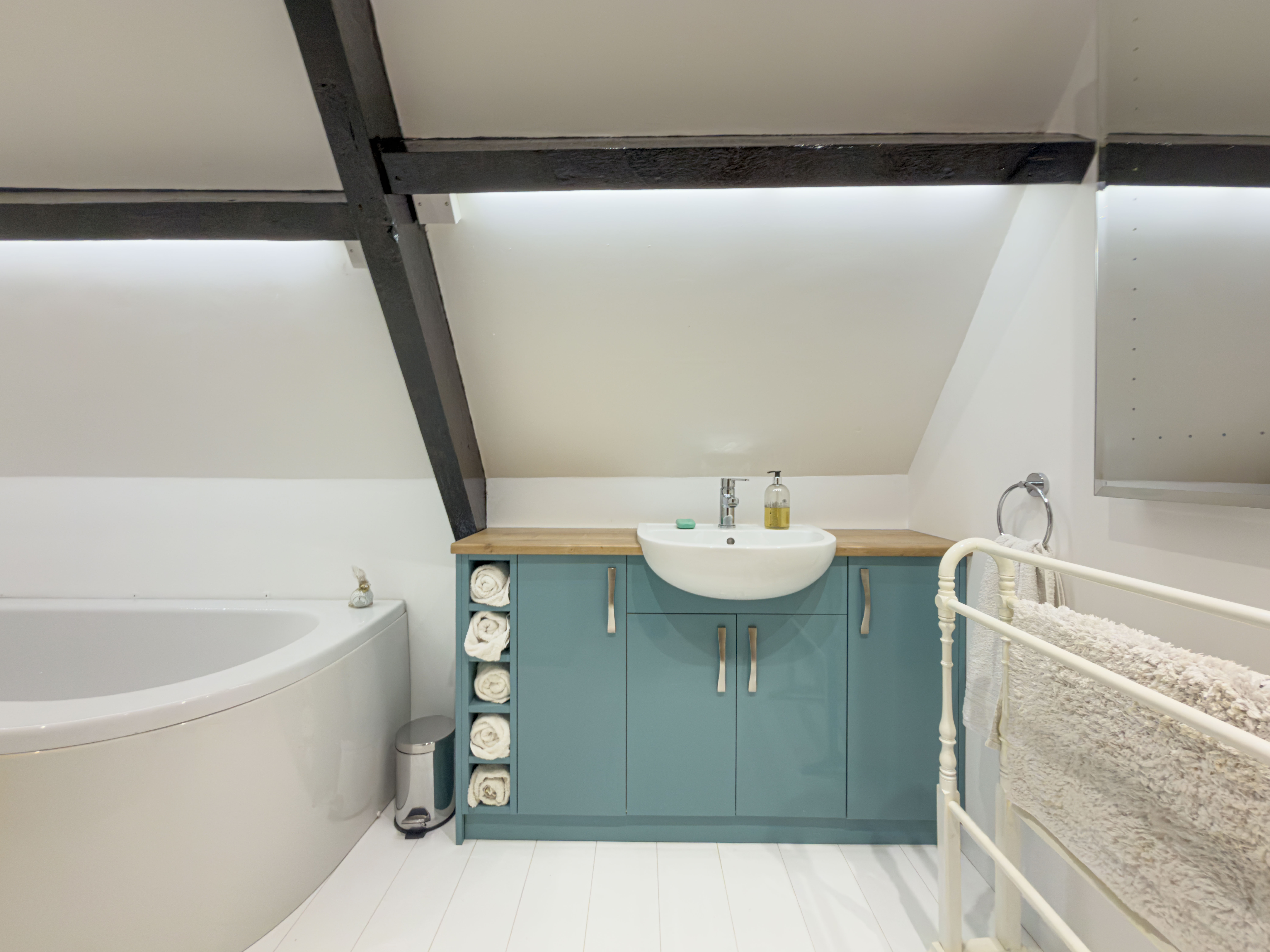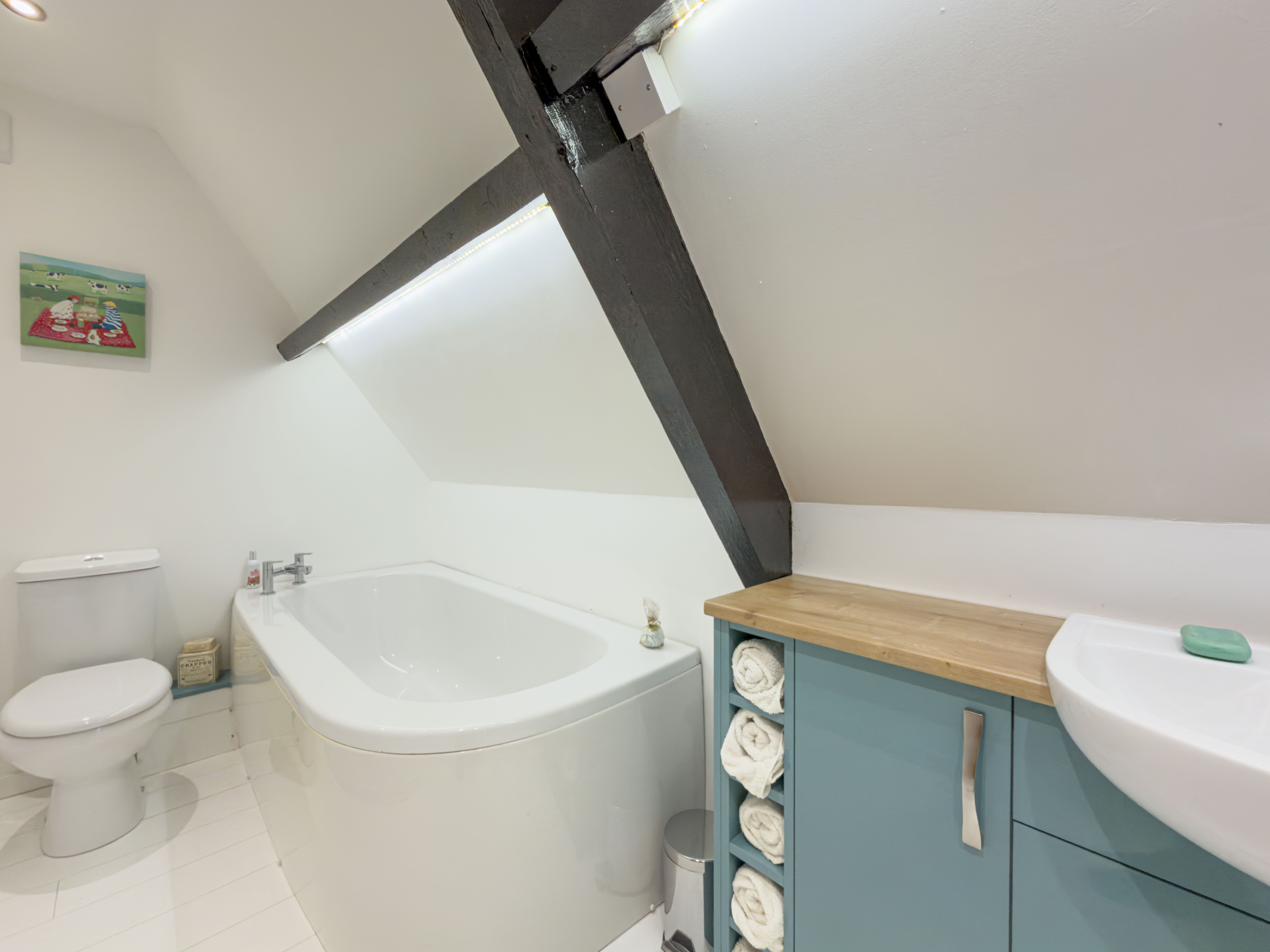 The top floor bathroom includes a bath, vanity basin and WC, illuminated mirror, with a wall-mounted radiator and wood-effect flooring throughout. The bathroom has both overhead lighting and recessed ambient lighting on the beams, offering flexibility to suit.