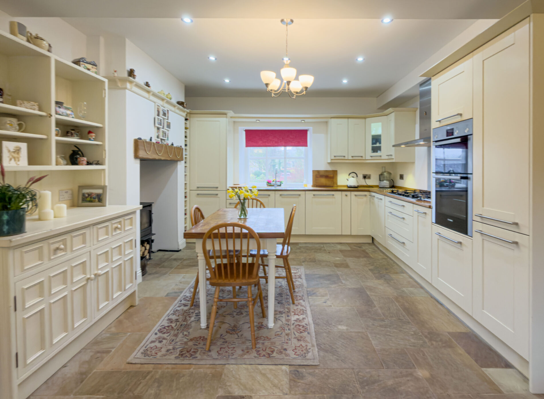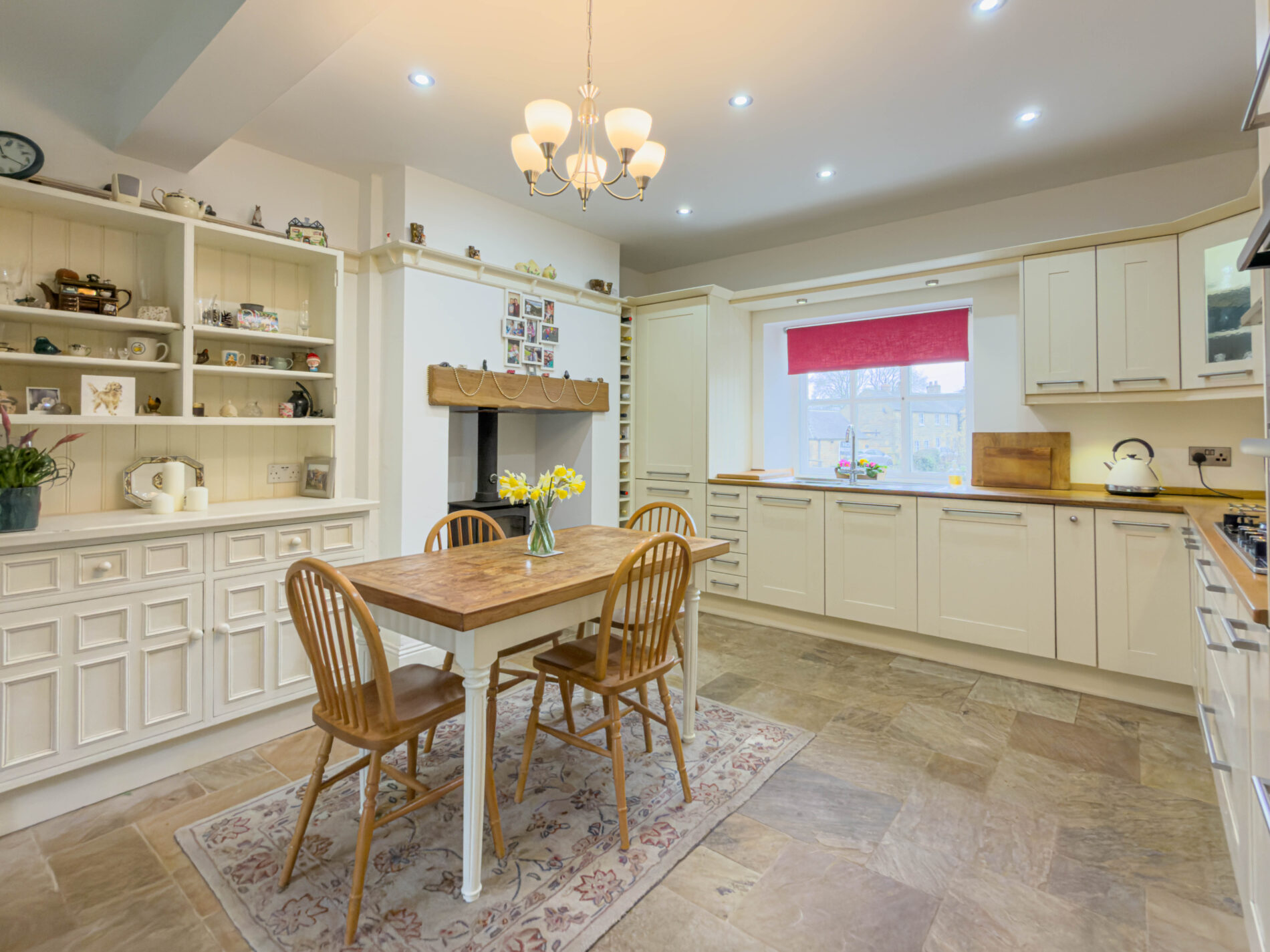 Old Reading Rooms offers characterful interiors and thoughtful specification throughout. The ground floor is anchored by a standout kitchen with stone flooring, cream units, a five-ring LPG hob with large extractor, fitted fridge-freezer, dishwasher and double electric oven, carousel and pull-out storage cupboards, and French doors opening to the garden — a multifuel stove and underfloor electric heating adds year-round comfort. A separate utility room handles the practicalities, while the living room, with its multi-fuel stove,set under an oak mantle provides a genuinely warm and relaxed heart to the home.