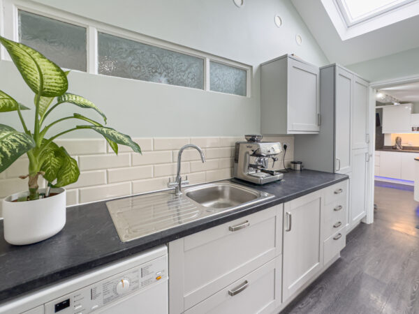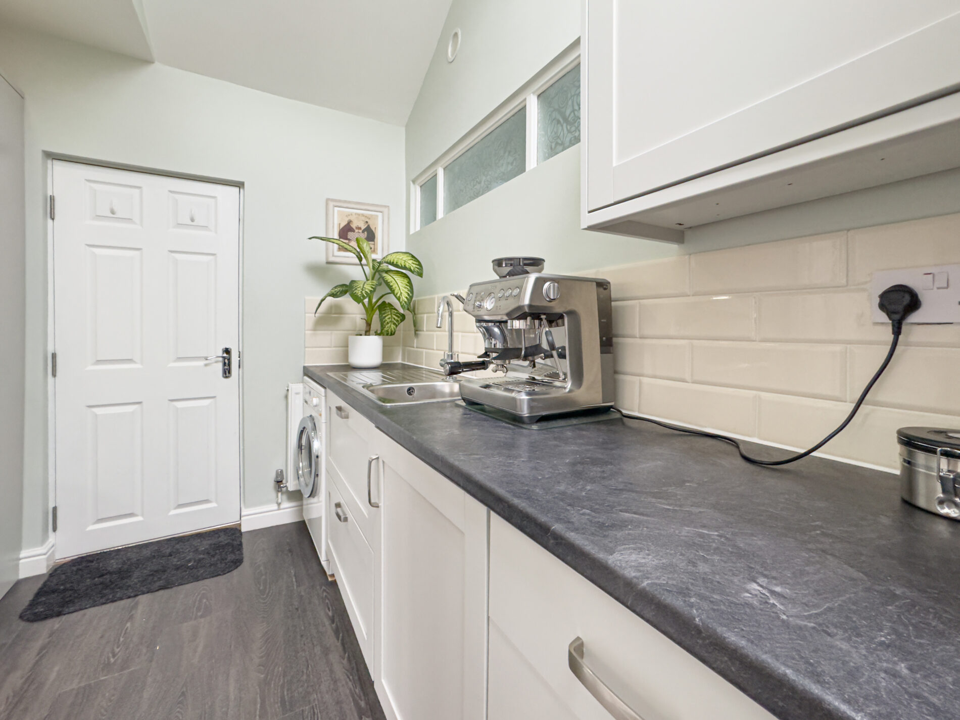 Off from the kitchen L shaped room is an essential utility area with vaulted ceilings and sky light. The utility also provides additional cupboards for storage of coats etc, extra worktop space and all plumbing for washing machine, drier and additional fridge freezer if required. The utility also offers loft space above the laundry and study areas.