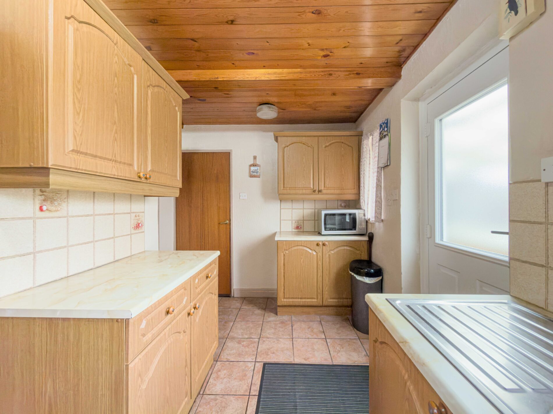 A good-sized fitted kitchen with a range of oak-effect wall and base units, generous worktop space and tiled splashbacks. Freestanding cooker with double oven. Tiled floor throughout. Door to the rear garden room/utility. There is a large pantry cupboard under the stairs.