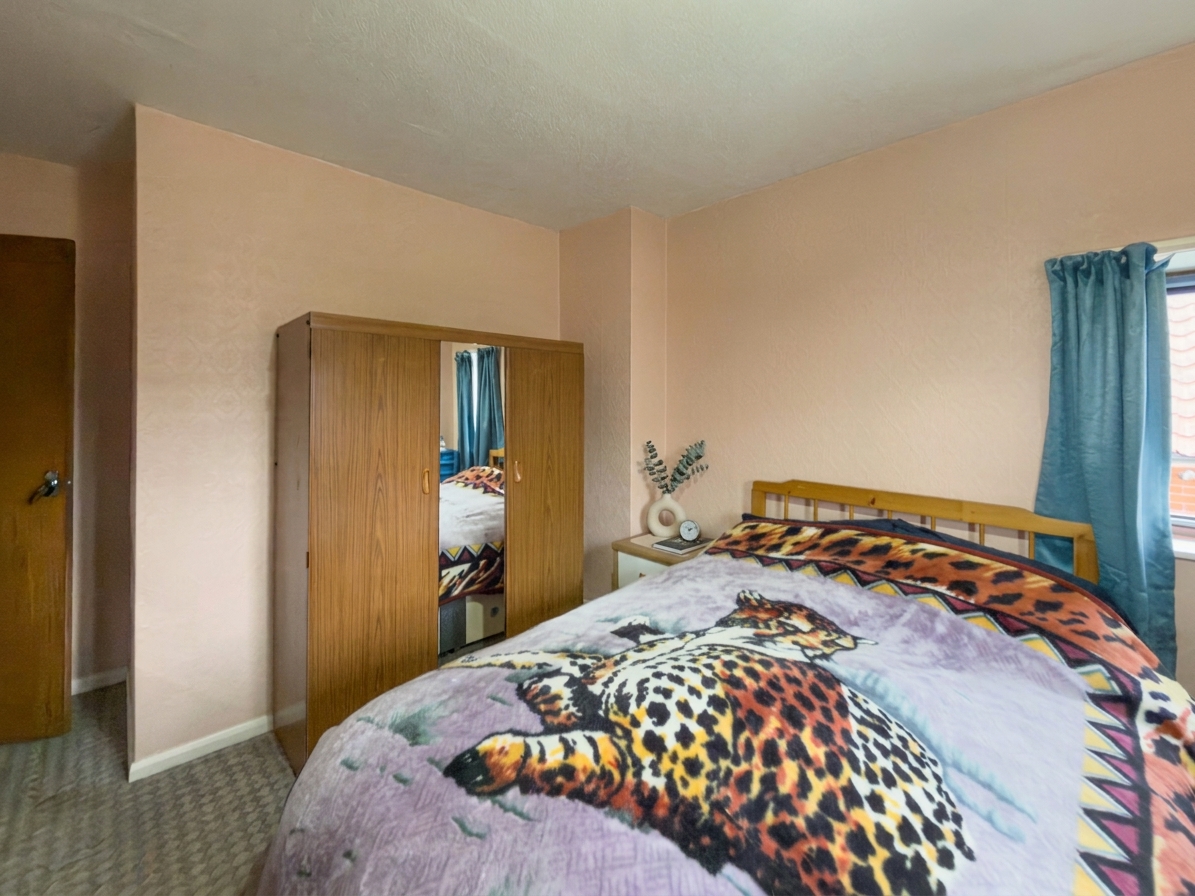 A generous double bedroom retaining an original fireplace surround, giving the room real character.
