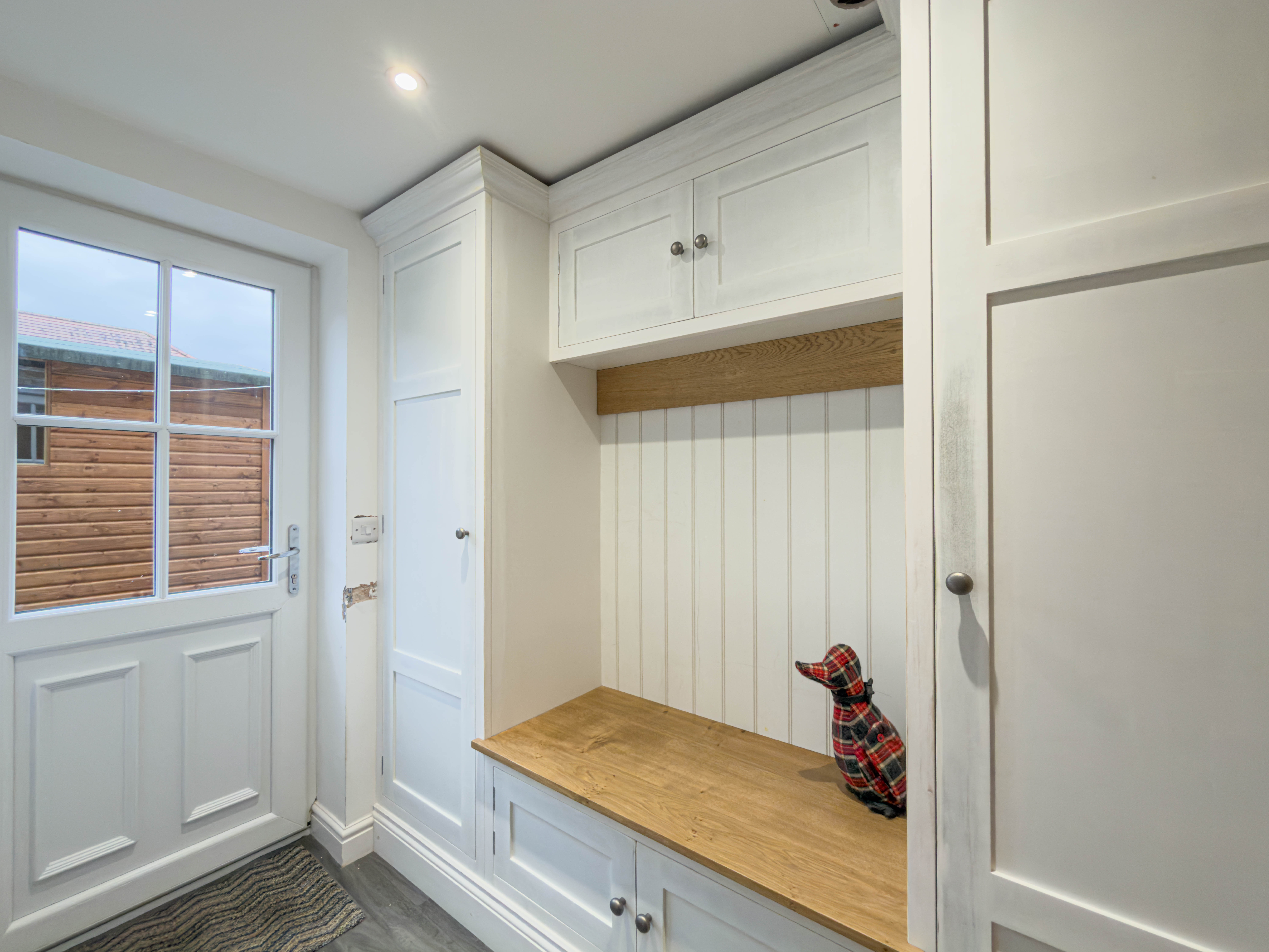 A practical boot room with a UPVC side door, fitted cupboards housing the gas boiler, and additional storage space — perfect for coats, shoes, and outdoor essentials.