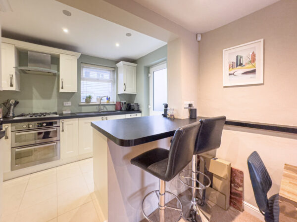 On entering through the front door you are welcomed into a large sitting room open plan with the kitchen. The sitting room has beamed ceiling and fire place feature, with built in storage under the stairs.