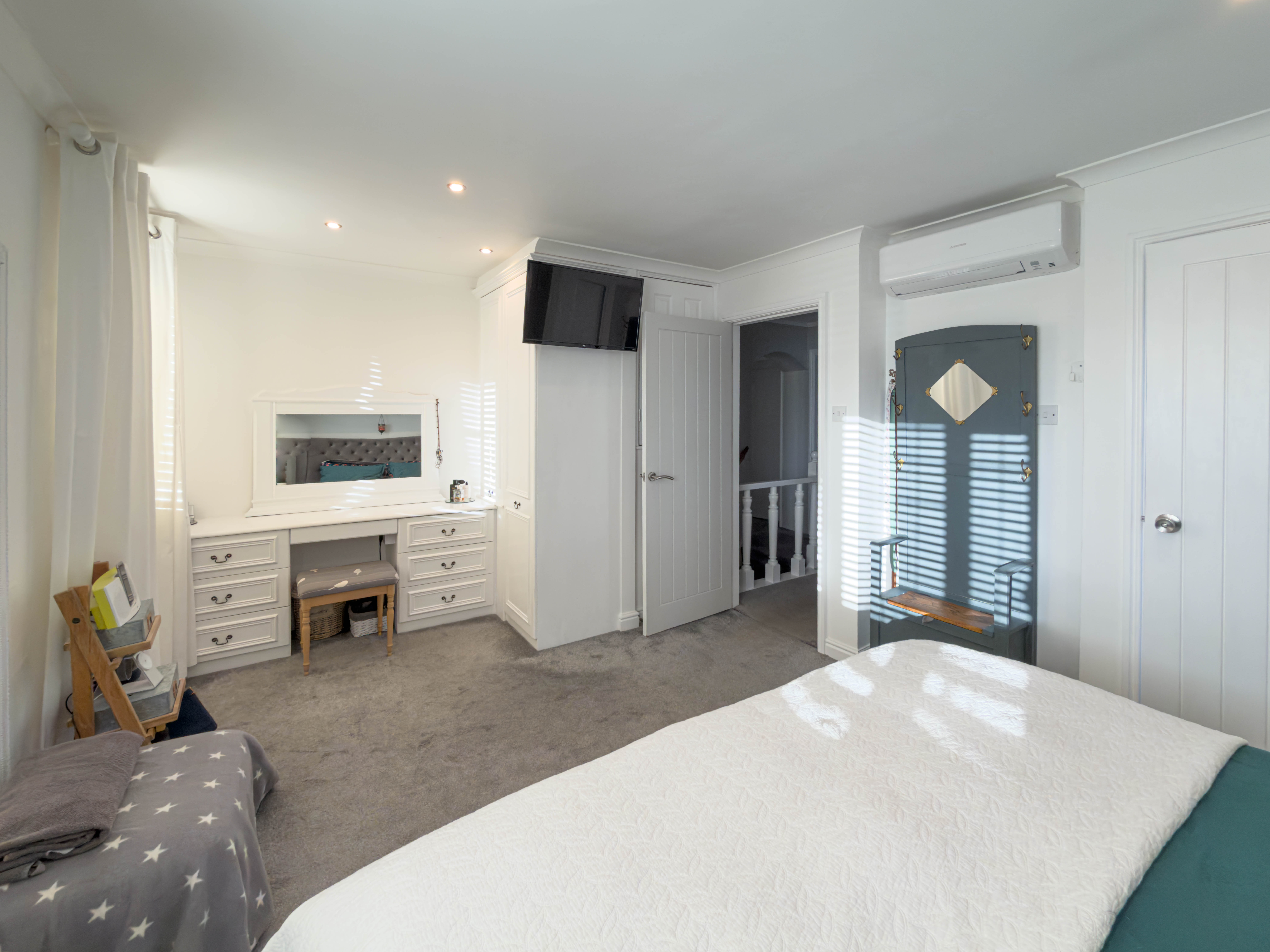 This large double bedroom has fitted storage that accommodates a super king bed, the dressing table and storage is also built in. With double windows to the front of the property the room is light and airy.