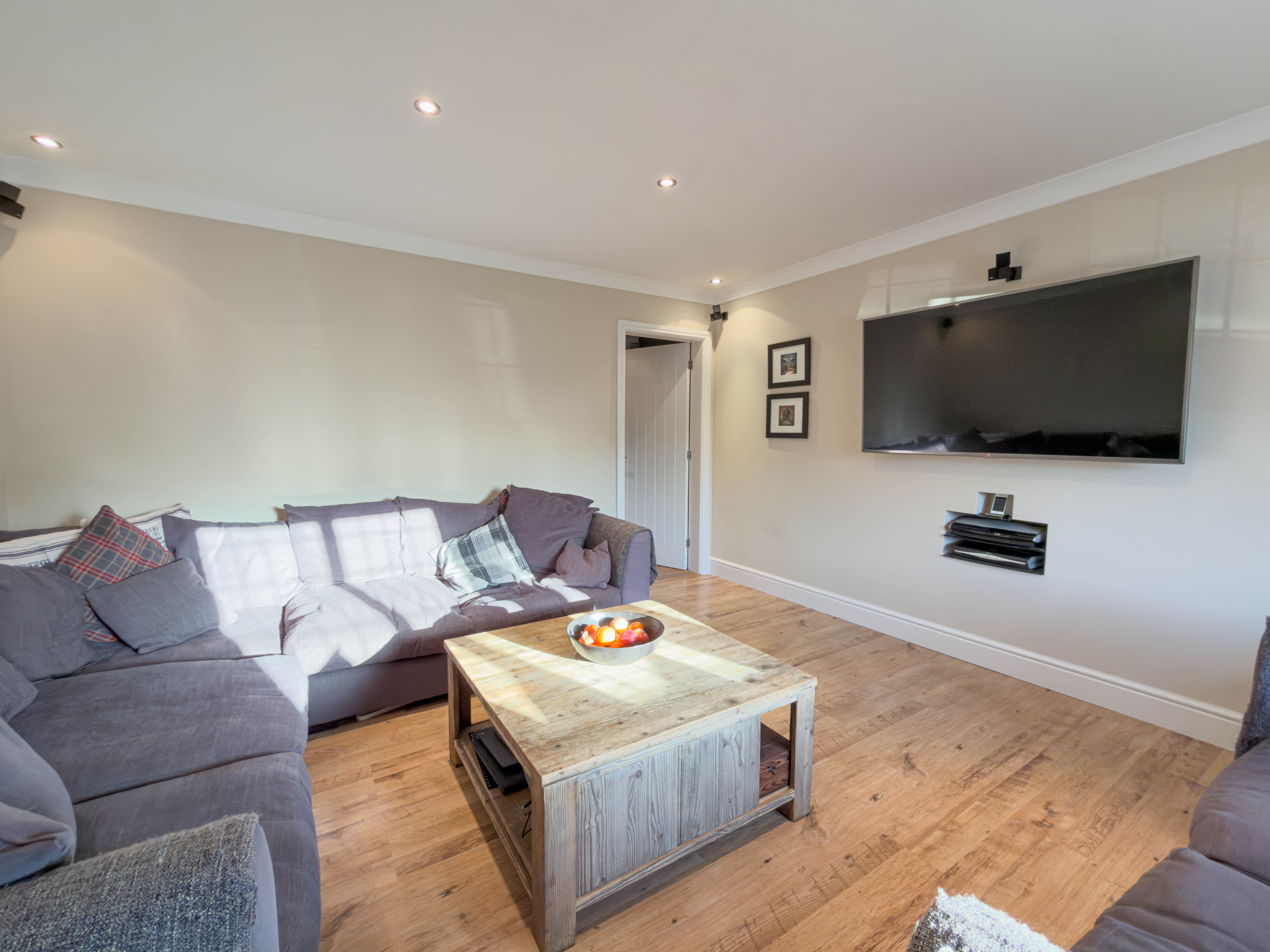 To the front of the property, the sitting room is fitted with a media wall and a large window to the front elevation. The wooden flooring throughout gives the property a lovely modern feel.
