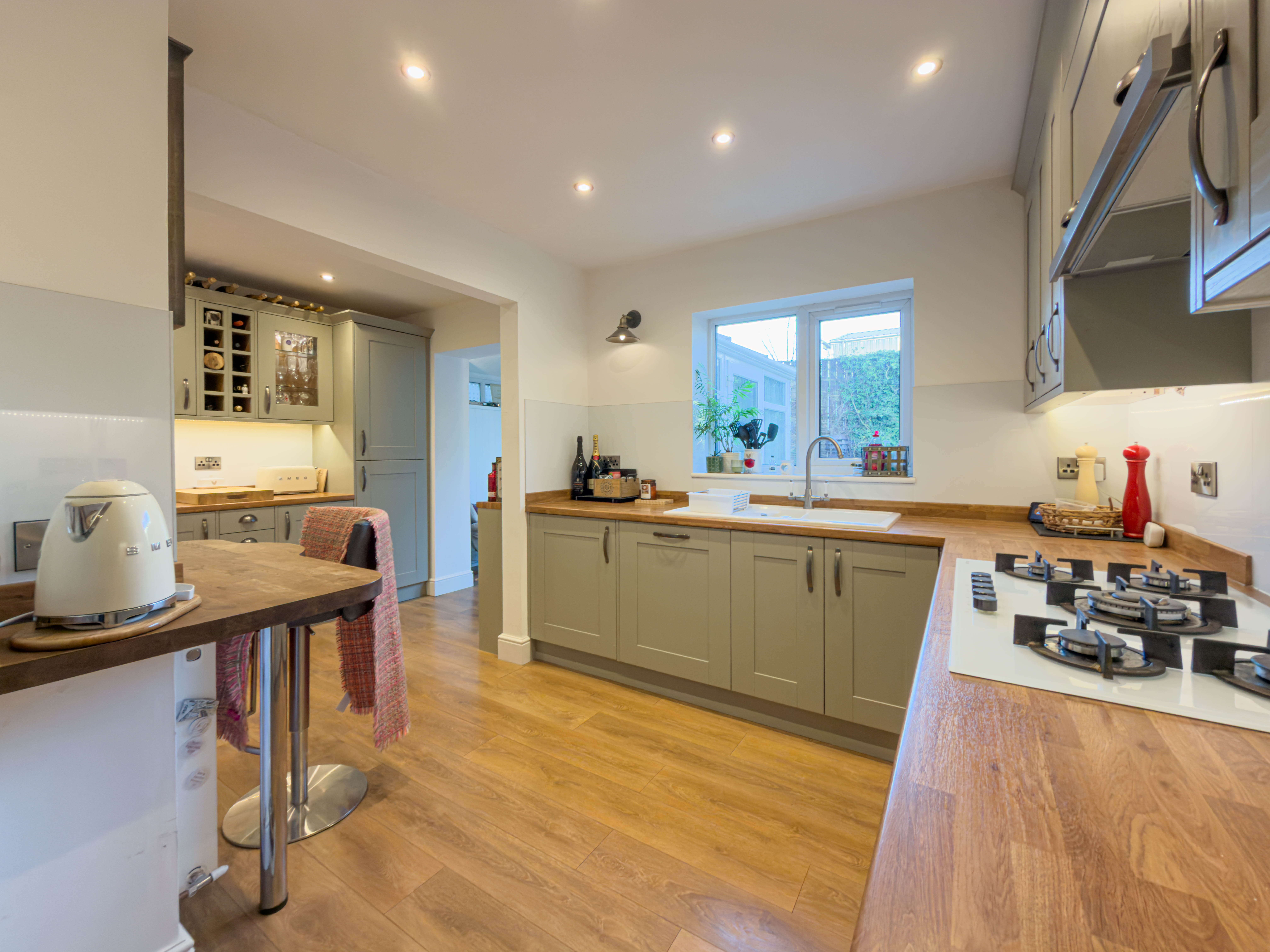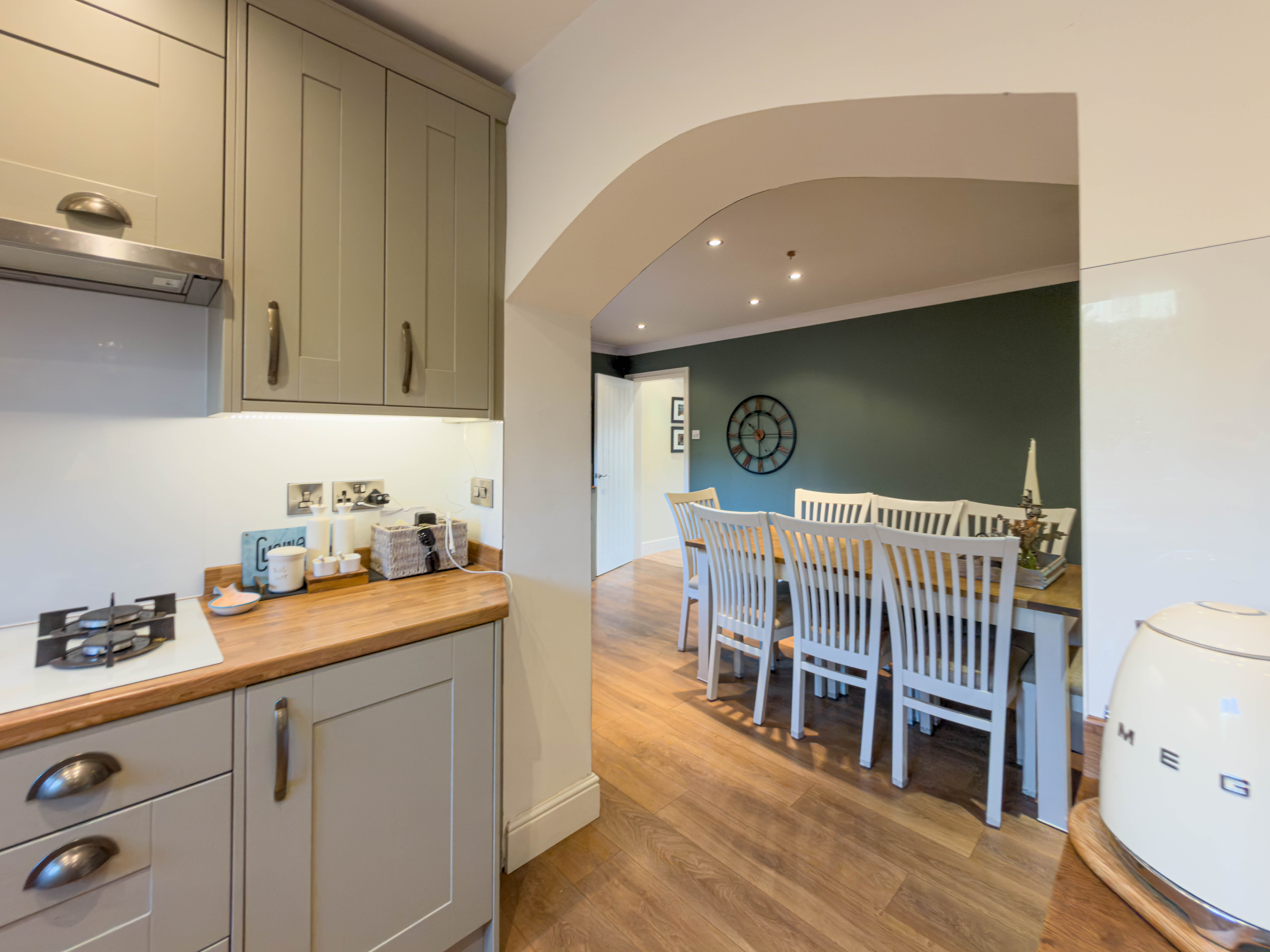 Open plan to the kitchen, the dining room has a window to the rear of the property. There is a large under stairs storage cupboard.